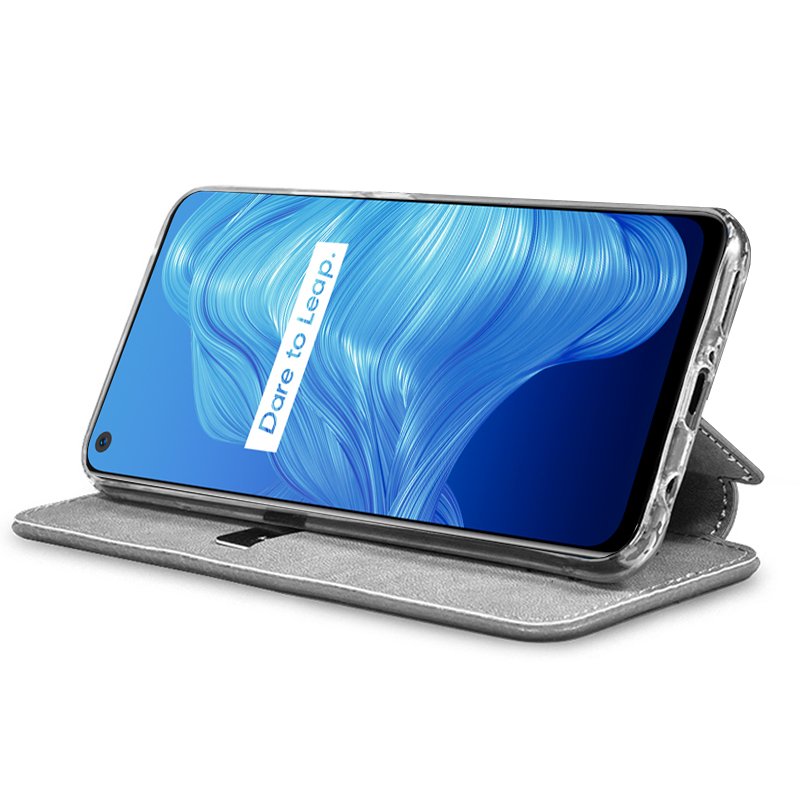 Apertura lateral tipo libro. Incorpora una carcasa específica del modelo de smartphone, para incrustarlo y dejarlo perfectamente encajado.