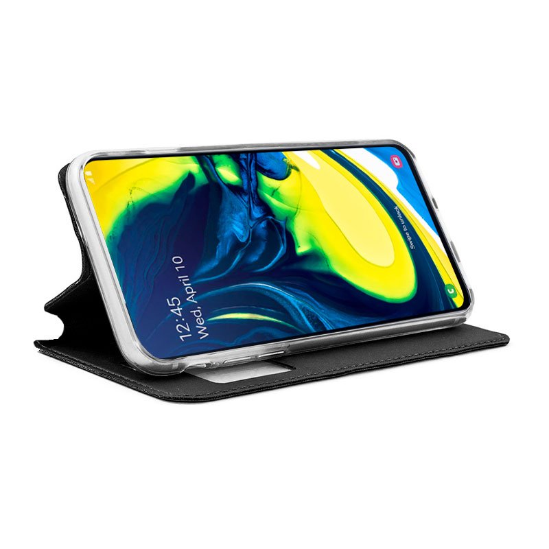 Apertura lateral tipo libro. Incorpora una carcasa específica del modelo de smartphone, para incrustarlo y dejarlo perfectamente encajado.