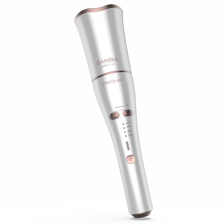 Bamba Surfcare 800 Magic Waves ProRizador de pelo automático BAMBA SURFCARE 800 MAGIC WAVES PRO con revestimiento de Queratina y aceite de argán, cilindro XL, función Pro Ionizer y función memoria.El cilindro de rizado de Bamba Surfcare 800 Magic Waves Pro está recubierto con Queratina y aceite de argán, que se transfiere al cabello durante su uso, mantiene el cabello sano, fuerte y brillante.Cilindro XL. Nuestro cilindro es más largo que el de la competencia, para un moldeado el doble de rápido en una sola pasada.Gracias a una superficie más larga, nuestro rizador puede enrollar más cabello y moldear más cerca de la raíz en una sola pasada.Agarre vertical. El agarre de nuestro rizador permite una postura mucho más relajada y permite crear rizos simétricos en todo el cabello. El agarre del rizador automático consigue que sea más fácil y seguro de usar, alejando el punto de sujeción del elemento calefactor.Rizos profesionales. Gracias a la posición vertical del cilindro, el pelo se enrolla alrededor como si de un moldeador profesional se tratase, para conseguir un moldeado uniforme. Además, sus opciones de configuración ayudan a que tengas el control total de la temperatura para unos rizos mucho más duraderos, definidos e hidratados.El rizador automático de Cecotec tiene función de memoria que permite guardar la configuración exacta que utilizaste en tu sesión anterior, para que solo te tengas que preocupar de usar el producto para obtener rizos profesionales día tras día de forma rápida y sencilla.El sistema de rizado en 3 direcciones permite crear rizos en dirección hacia la cara, al revés o alternar la dirección para crear looks más naturales y espectaculares de forma inmediata.La temperatura ajustable entre 150º – 210 ºC, en 4 posiciones predeterminada, permite que sea apto para todo tipo de cabellos y permite crear distintos estilos como tirabuzones, ondas marcadas u ondas playeras.El rizador automático de Cecotec está diseñado para un calentamiento del cilindro uniforme y rápido, estando listo para usarse en sólo 30 segundos, para que puedas comenzar a crear tu look sin largas esperas.El cable es de 3 m y con sistema 360º para no limitarte el movimiento al usarlo, además incluye una resistente anilla para colgarlo mientras no lo uses.Incluye un sistema de apagado automático que desactiva el rizador pasados 30 minutos de inactividad, evitando así el calentamiento excesivo del producto y alargando su vida útil.Función Pro Ionizer generadora de iones.