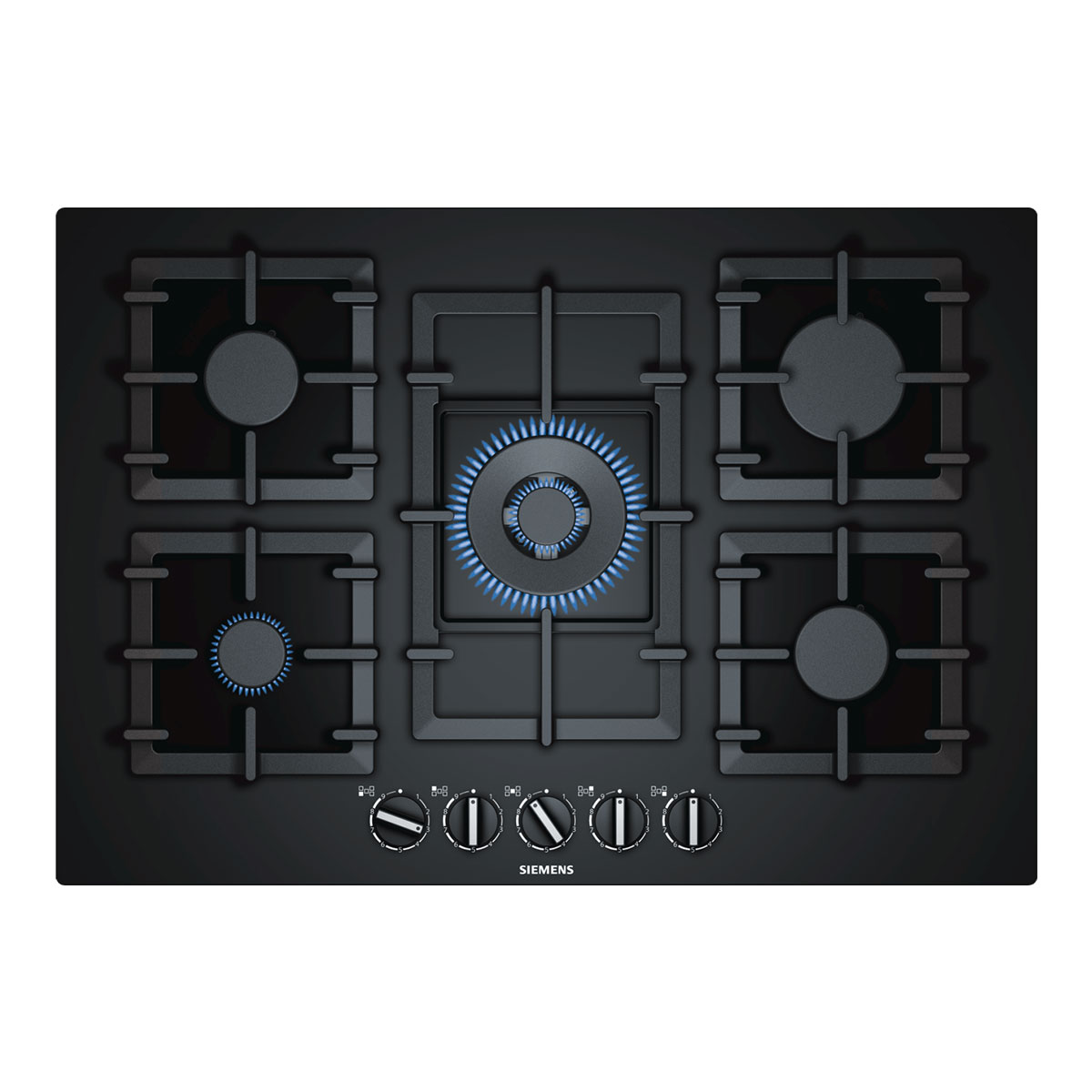 IQ500, Placa Gás, 75 cm, vidro endurecido, 5 queimadores (1 wok c/ duplo circuito), stepFlame, isqueiro integrado, seg. termoelétrica gasStop, grelhas ferro fundido individuais