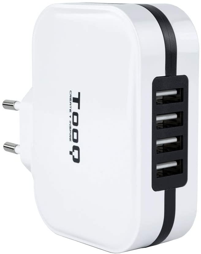 Cargador de pared con cuatro puertos de USB. Diseño muy elegante, moderno y práctico.Características:-Potencia: 34 W. Cantidad de puertos USB: 4-Tecnología de AI incorporado que detecta la corriente de entrada de los dispositivos conectados para maximizar tanto la compatibilidad como la velocidad de carga (hasta 2,4 Amp por cada puerto USB).-Salida: 5V 6.8 A total (Hasta 2.4 A / puerto USB)-Entrada: 100-240V~50/6 0Hz 0.9 A-Certificación: CE y RoHSEspecificaciones:Control de energía:-Voltaje de entrada: 100 – 240-Voltaje de salida: 5 V-Corriente de salida de adaptador AC: 6,8 A-Frecuencia de entrada: 50 – 60-Potencia máxima: 34 W-Corriente de entrada: 0.9Diseño:-Color del producto: BlancoDesempeño:-Tipo de cargador: Interior-Compatibilidad del cargador: GPS, Mando para videojuegos, MP3, MP4, Teléfono móvil, Smartphone, Tableta.-Alimentación: Corriente alterna-Cantidad de puertos USB 2.0: 4-Certificación: CE, RoHS