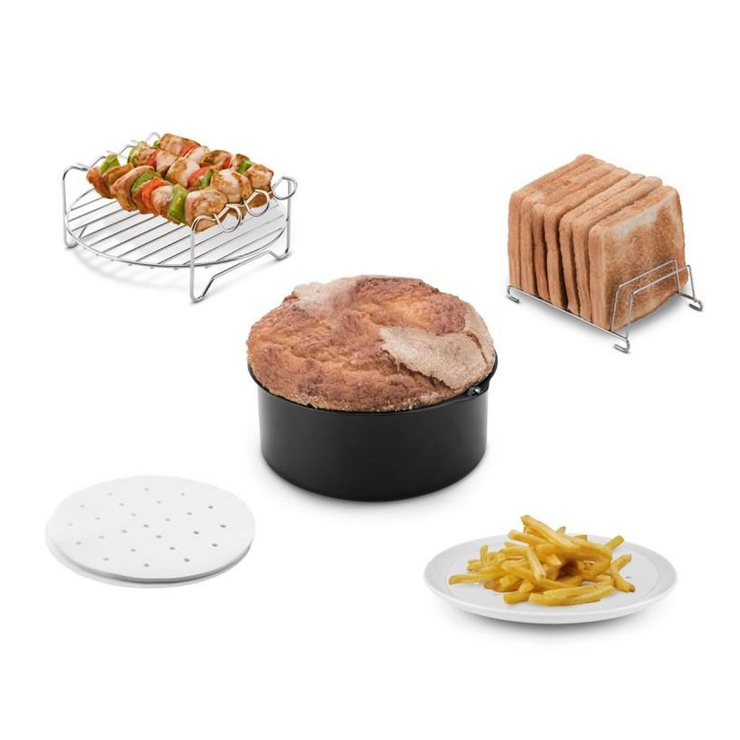 Pack de 4 accesorios para fritadeiras de ar a partir de 3,5l Molde para bolos Grelhador + 3 espetos Bandeja de torradas Pack 50 ud papel vegetal