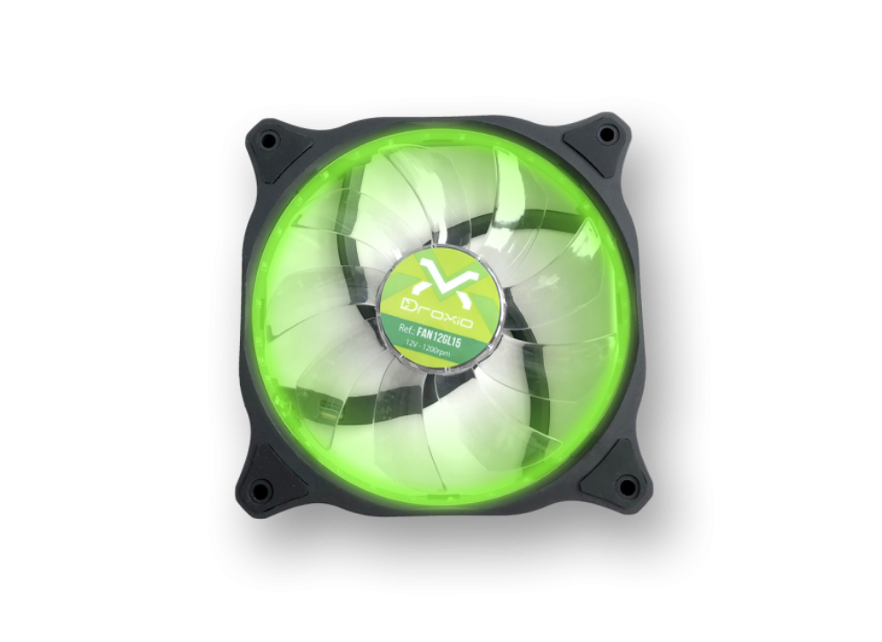 Ventilador caja HOLOGRAM 120mm con 15 LED color verdeVentilador adicional de diseño actual para caja de PC de 12×12cm con 15 leds verdes, para darle un toque moderno a su pc. Perfecto para cajas con lateral y frontal transparente como la Droxio HOLOGRAM.Con una velocidad de 1.200rpm y un flujo de aire de 43.96 cfm, es uno de los ventiladores más silencioso, gracias a sus rodamientos Hydraumatic, que sólo dan un nivel de ruido de 16dBA±10%